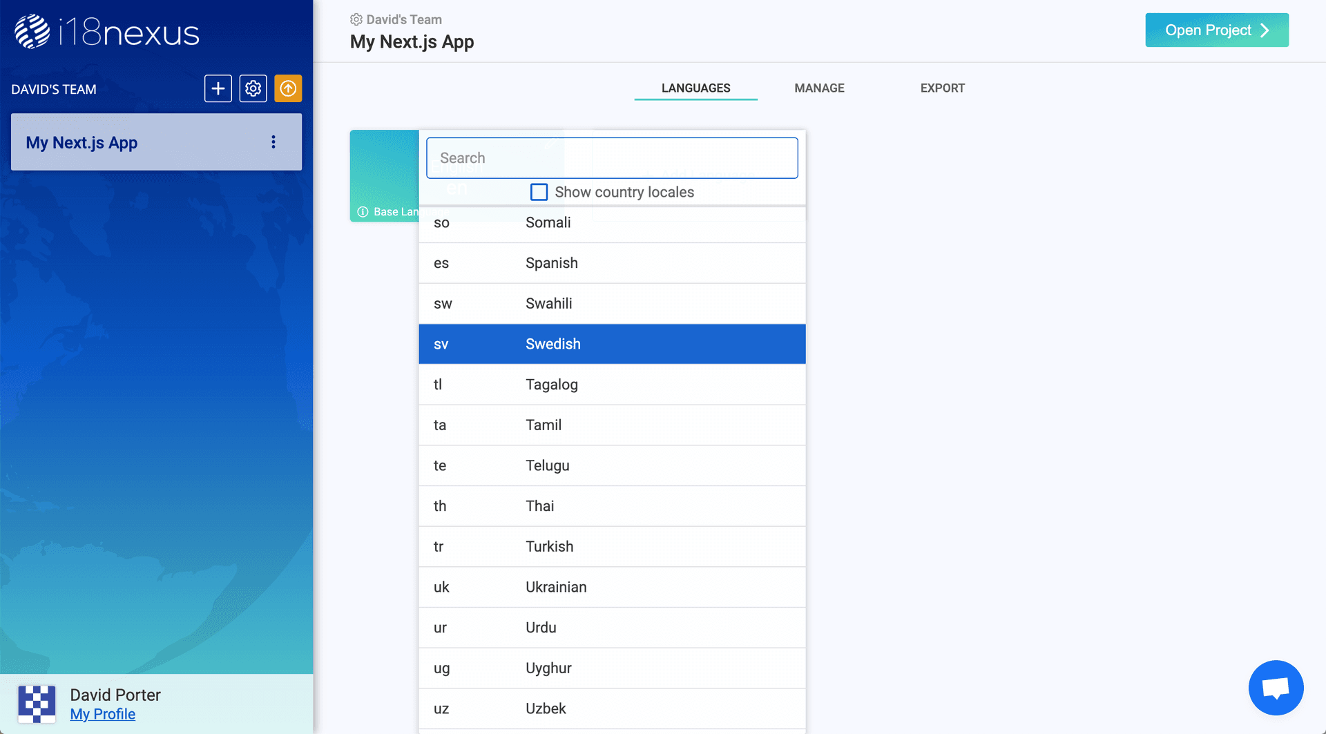 Next, we’ll click Add Language to select the locales that we want our app to support. Since we already added sv (Swedish) to our locales list in next-i18next.config.js, we’ll select Swedish: